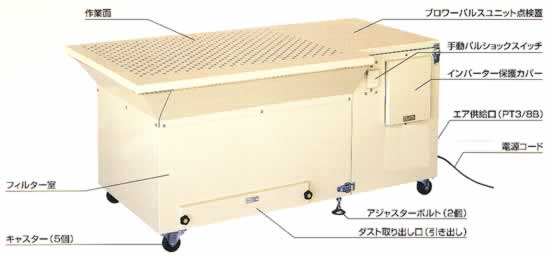 磨く、削る、払う、袋詰めなどの作業にお使い下さい。![]() ■特長 ホコリまみれで行われていた作業も、デスクコレクターで快適な作業環境に生まれ変わります。 テーブル面に無数にあけられた小穴から、ターボファンがホコリを吸引します。 また、ホコリや衝撃に強い保護カバー付きインバーターを標準装備し、吸引力を調節することにより節電でき、フィルターの負担を減らすことで寿命を延ばすことにもつながります。 種類はテーブル面が944×790(1.6kW)、1100×860(2.3kW)の2種類を用意。 手動パルショックによりフィルター塵落としが簡単、強力に行えます。 ダストの処理は引き出し式。キャスターとアジャスターボルトの組み合わせにより、メンテナンスと移動のしやすさを追求しました。 オプションとして製品を傷から守る保護シート(材質:発泡ポリエチレン)、吸引力の性能を高めるフードを用意。 ■作業例 ![]() ■部分名称 ![]() ![]() ![]() ![]() ■寸法図 ![]() ![]() ![]() ■タイプ