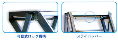 ■特長![]() ●可動式ロック機構 特許取得の可動式ロック機構を採用しています。 上からの荷重に強く、昇降中はロックが外れにくい安全設計です。 ●人に優しい 踏板を持ち上げるとロックが解除されるので、折り畳みも簡単です。 折りたたむ際に使用するスライドレバーは、握りやすい「ひ」の字形のユニバーサルデザインです。 ●環境に優しい 環境にも配慮しており、高所作業用踏み台や脚立業界では日本で最初に6大有害物質の排除をしました。 ![]() ■タイプ