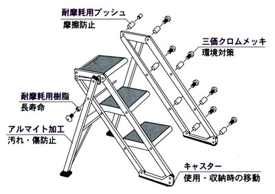 ●環境を考えた商品です アルミ折りたたみ式ステップは環境に配慮し、補強部材はもちろん、ボルトやスペーサーなどの細かい部品まで鉄製の部材は、全て鉛フリーの三価クロムメッキを使用しています。また、アルミやPETなどリサイクル性が高い材料を多く利用しています。 |