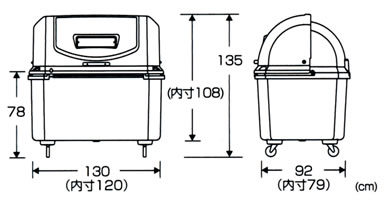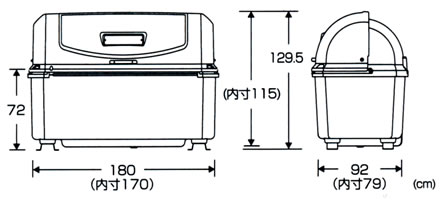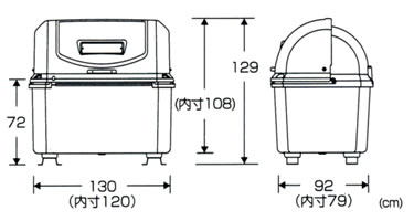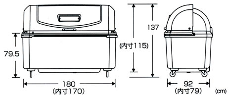■特長 ●持ち手付き。ラクに開閉できます。 ![]() ●お掃除ラクラク 底面がシンプル形状なので掃除がしやすく、いつも清潔に使えます。 ![]() ●アイボルト付き 風が強い時はロープ等で固定できます。 ![]() ●排水口付き 内部に排水口が付いているので掃除がしやすく、いつも清潔に使えます。 ![]() ●表示プレート付き 分別などに便利です。 ![]() ●大型キャスター 凹凸の場所でも移動しやすい大型キャスター付きです。 ※キャスター径10cm(キャスター付きタイプ) ![]() ●カギ穴付き カギの取り付けができるので勝手にフタを開けられる心配がありません。(商品にカギは含まれません。) ![]() ■脚仕様(MI3R-1000-94480-6T・MI3R-1500-94482-0T) アンカーで固定できます。 ![]() ■寸法図