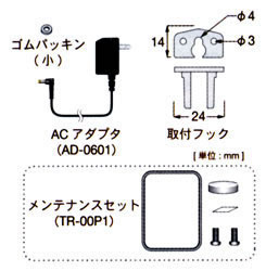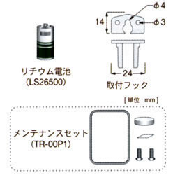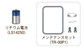 ●メンテナンスセット/品番 TR-00P1 パッケージ内容: ゴムパッキン(データロガー裏フタ用) シリカゲル(乾燥剤) 両面テープ(シリカゲル固定用) ネジ(データロガー裏フタ用予備) ![]() ●低温電池セット/品番 TR-00P2 パッケージ内容: チューブ付きリチウム電池(LS14250) メンテナンスセット(TR-00P1) ![]()