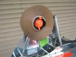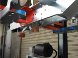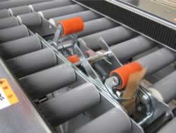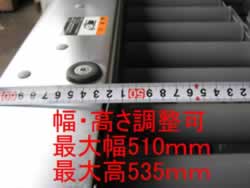 ロットランダム式、上下シール機です。 サイドベルトの幅調整、テーピングの高さ調整は、ハンドル操作で簡単です。 |