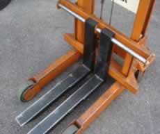 ・800kg・・・・・・・1.3m〜1.8m、昇降、走行とも手動式です。どなたにも簡単に使用できます。 ・フォークの巾は調整することができます。 ・ウインチユニットは、当社独特のワイヤーロープ手動巻取式・・・・・効率の良い設計です。 |