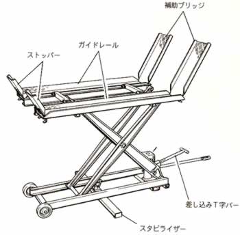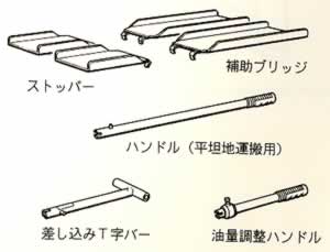 ■本体・上昇時![]() ![]() ■ジャッキ部 ![]() ■本体収納時 ![]() ■付属品 ![]() ■製品構成 ●シーザー、リフト部 ●ジャッキ部 ●ガイドレール ●スタビライザー ●平坦地用キャスター ■標準付属品 ●ストッパー ●補助ブリッジ ●ハンドル(平坦地運搬用) ●差し込みT字バー ●油量調整ハンドル ●取扱説明書 ■仕様