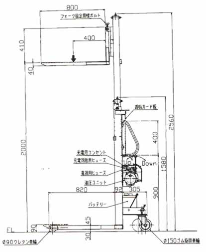 ●100kg・2mまで昇降できる高揚程用で、マストは2段伸縮式で揚高により変化します。・・・移動時は低く、作業時は高く ●昇降はバッテリー電動油圧式で走行は手動式。 |