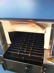 コンベアスピード調整は、インバータにより可変できます。 デジタル温度調節器の採用により、炉内の温度が常に安定しています。 冷却回路の採用により、ヒーターカットと同時に炉内が冷却され自動的に運転が停止します。 製造年月:平成13年6月 |