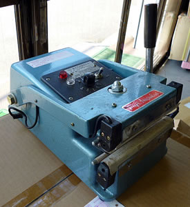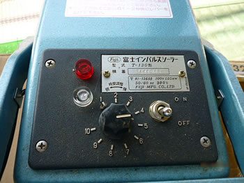 手軽なハンドル操作で約100kgの強力なシール圧力が発生し、上下加熱方式による高い温度のヒーター発熱で単体袋から厚手ガゼット袋、お茶袋、コーヒー豆袋、紙などのラミネート袋まで幅広く対応します。 | 中古富士インパルス茶袋用シーラー 品番 T-130 問い合わせ番号 Z-0606-3 完売 |
