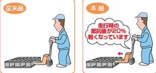 走行性に特化した設計で、従来品より走行時の抵抗値が約20%軽くなって軽快です。(※当社比) | 軽快ハンドパレットトラック 品番 M227HPA-L-20LT 問い合わせ番号 Z-0611-4 完売 |
