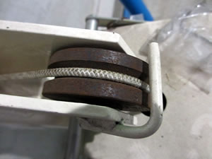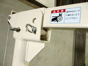 ■外形寸法図(前方設置タイプ) ●注意事項 @ロープは外面、保護材(ポリエステル)が破断、又は著しく破損しているものはロープの交換を取扱店へ依頼して下さい。 A角の部分に直接ロープを当てると破損の原因となりますので角の部分に当てた使用は避けて下さい。 B直接、吊り荷に本機のロープを巻きつけて使用は避けて下さい。 C使用時にハンドルを回すとロープがほぐれる恐れがあるのでハンドルを回さないで下さい。 Dアウトリガーを必ず取付けて作業して下さい。 ![]() |