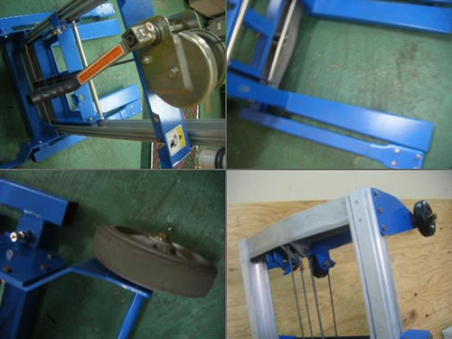 ベース可変型ですので、床面に置いたパレット・コンテナをそのまま持ち上げることができます。(最大内寸幅930mm) フォークと脚部は簡単に取り外すことができ、持ち運びが容易です。 ウインチは安全ブレーキ付で、ウインチハンドルから手を離すと、フォーク部はその位置で自動的にロックされます。 |