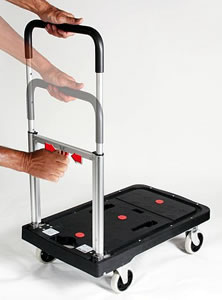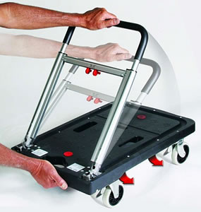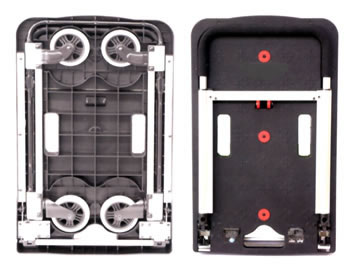 | ■特長 ●コンパクトな軽量設計と驚くべきタフネスを両立させ、発表から大きな反響を呼んでいるシリーズ。おりたたみ台車の常識を覆す頑強な作りは、重たい荷物を運ぶ際にも抜群の安定性を誇ります。さらには格納式ホイール機構により、場所を取らず、コンパクトに収納できます。一家に一台!車に一台!バンドに一台!etc、様々な場面で大活躍すること間違いなしのお勧めおりたたみ台車です。 ●頑強な作りで安定した積載性。格納式ホイール機構が搭載され収納スペースを選びません。かさばる物から重量系の荷物も快適に運搬する事が可能なおりたたみ台車です。 ●後輪は固定、前輪は回転します。 ■折りたたみ・伸縮方法 ![]() ■折りたたみ時 ![]() ■使用例(コンテナはついておりません。) ![]() ■仕様
