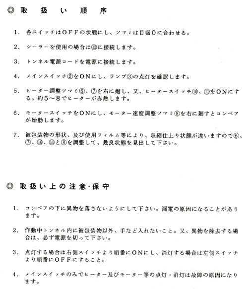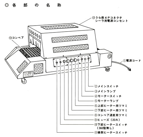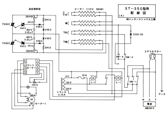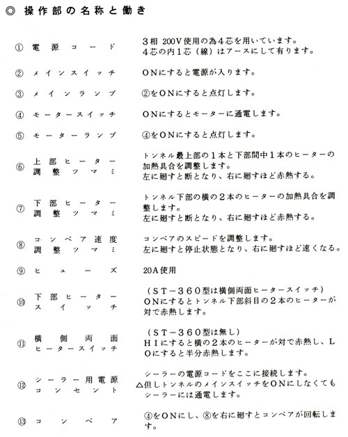 1.品番 ST-350 2.容量(ヒーター) 4KW 3.電源 共通 3相200V 50/60HZ 4.コンベア速度 毎分0〜12m |