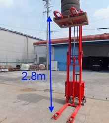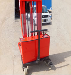 重量物の上げ下げだけならもってこい。 手押しタイプの簡易スタッカー。 昇降のみ電動油圧です。 |