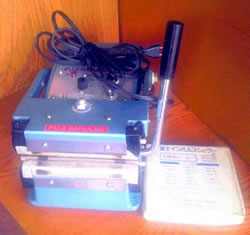 手軽なハンドル操作で約100kgの強力なシール圧力が発生し、上下加熱方式による高い温度のヒーター発熱で単体袋から厚手ガゼット袋、お茶袋、コーヒー豆袋、紙などのラミネート袋まで幅広く対応します。 | 中古富士インパルス茶袋用シーラー 問い合わせ番号 Z-0683-1 品番 T-130 完売 |
