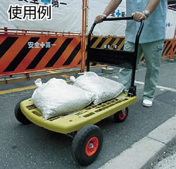 ●従来の台車では走行が困難な悪路でも運搬作業可能。 ●前輪に大径車輪を使用することにより、走行時の段差乗り越えに優れています。 ●空気入りタイヤ仕様の為、走行時の凸凹路面での衝撃を和らげ、安定・静粛に走行できます。 |