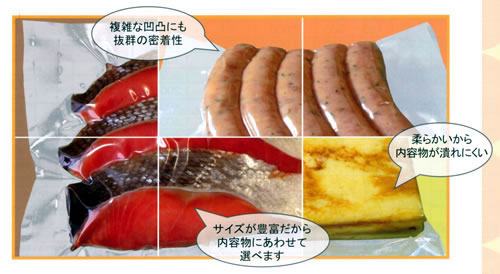 | ■特徴 ●三方シール規格袋が豊富な種類で登場 ●使い勝手の良い75μmの厚み。 ●共押出チューブフィルムの高い柔軟性と美しい外観が内容物を引き立てます ●真空・冷凍・ボイルタイプ(内容物・使用条件により可能域が変わります) ![]() ■用途例 ●水産…鮭・マグロ・ブリ・カンパチ等の切り身、タコ、イカ、数の子、蒲鉾、珍味等 ●畜産…ハム、ソーセージ、生肉、味付け肉、焼き豚、豚の角煮、モツ煮等 ●農産…山菜、カット野菜、ドライフルーツ、漬物、麺類、菓子類、豆腐、厚揚げ、こんにゃく等 ●惣菜…卵焼き、佃煮、煮豆、ハンバーグ、ミートソース、餃子、厚揚げ、マリネ、チーズ等 ●その他…肥料、機械部品、電子部品、産業用資材等 ![]() ■製品物性
