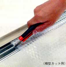 | ■特長 ●作業台横に置いて頂くと梱包作業を楽に行って頂けます。 ●梱包資材を引っ張り出して、カッターガイドに沿ってカットすると、真っ直ぐに切れます。 ![]() ■仕様