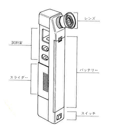 | ■特徴と使用範囲 本器は肉眼で環境気中の浮遊粉塵(エアロゾルの大気の濃度を評価するために 作られた簡易検知器です。家庭、病院、精密測定室、レストラン、事務所、工場などでの 浮遊粉塵(エアロゾル)を簡単にチェックできます。 本器は従来の測定器にはなかった空気中の浮遊粉塵を視覚でとらえるという、 今までにはまったくなかった考え方によって開発されました。 「いつでも」「どこでも」「だれにでも」簡単にご使用できます。大気の観察に、健康管理に、環境機器の確認に、 まるで小宇宙のようなイベントをお楽しみください。 ■各部名称 ![]() ■使用方法 1.試験室に粉塵がない場合は暗黒世界になります。 2.スライドカバーをスイッチがある方向にスライドさせてください、大気の試料が採集されます。 3.スライドカバーをもとに戻し、スイッチを押しながら覗いてください。 小宇宙のような輝点が現れます。これが浮遊粉塵(エアロゾル)です。 4.空気清浄機のチェックは、スライドカバーを開いて吹き出し口に密着させ、そのままゆっくりとカバーを閉じてください。接眼部から中を覗いてみてください。 ■原理 夜空にまたたく星や星雲は、日中ではとても肉眼では見えませんが、 夜になると光り輝き私たちにもみることができます。 本器はこのような宇宙の原理を応用し、肉眼では見えない微小粉塵を 暗黒視野の中に輝点としてみる装置です。 本器は取り入れた空気を静止捕捉し、その中の浮遊粉塵に 強い光を照射して拡大観察するようになっています。 本器は浮遊粉塵の動きを極力小さくするための特殊な工夫がされ、 また見やすさのためにも独創的な工夫がされています。 ■水質検査について 本器は専用の検査用ガラス瓶で水質のチェックもできます。水道水、井戸水、浄水器を通した水質を比較してください。 検査方法は試料室にガラス瓶を挟み込み、スライドカバーで抑え、スイッチを押しながら接眼レンズを覗いてください。 不純物の様子がよくわかります。 <注意>ガラス瓶の縁に強く輝く「光」ができます。長時間見つめないでください。 ■仕様