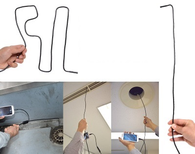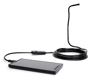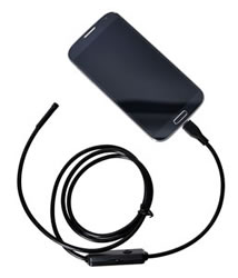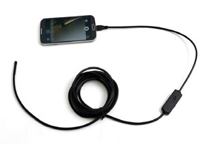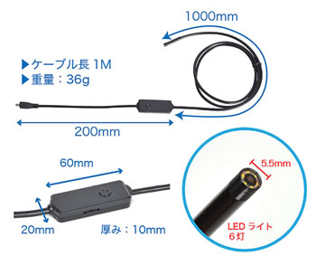 ●お使いのAndroidスマートフォン・タブレットをモニター代わりにして使用できる内視鏡ケーブル ●パソコンいらずで手軽に使用でき、電源がとれないような場所でもご利用頂けます。 ●カメラ先端部の径は5.5mm、LEDライトは6灯で明るさ調節も可能です。 |