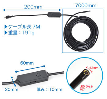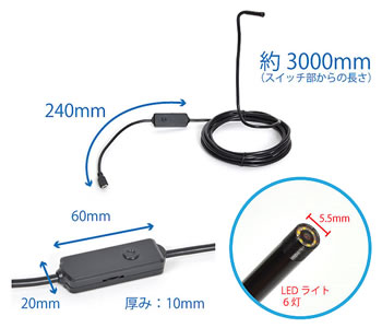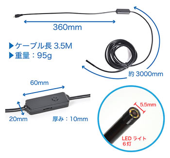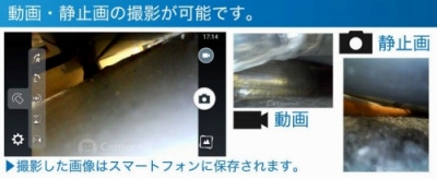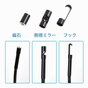 ■特長 ●お手持ちのAndroid端末がモニターになる内視鏡ケーブルです ![]() ●スマホが内視鏡に早変わり。パソコン要らずで観覧可能。 電源が取れない場所での使用も簡単に行えます。 「Androidスマホ対応φ5.5mmファイバースコープ」と、OTG機能(USBホスト)対応のスマートフォン・タブレット。この2つがあれば、スマートフォン・タブレットが内視鏡に早変わり。 使い方も簡単で、スマートフォン・タブレットに表示・録画アプリをダウンロードし、あとは「Androidスマホ対応φ5.5mmファイバースコープ」を接続するだけ。アプリは「CameraFi - USB Camera /Webcam」でのご利用をおすすめしていますが、他の表示・録画アプリでもご利用頂けます。普段持ち歩いているスマートフォンやタブレットが内視鏡になるので、様々な場所へ持ち歩くことや電源が撮れないような場所でもお使い頂けます。重くてかさばるパソコンをわざわざ持ち運ぶ手間もありません。 ![]() ●形状記憶ケーブルだから、自由に曲げて固定(M1080SFADH-3THのみ) ケーブルがフレキシブルに自由に曲げられ、好みの角度で固定することができます。 カメラの先端部分を持たなくても、形状記憶のハードワイヤーケーブルなので、ある程度伸ばしてもクネッと曲がり垂れることはありません。 ![]() ●機能充実!手軽なのにしっかり使用できます 先端カメラ径5.5mm、3種類のアダプタ付属 ![]() ●LEDライトの明るさはスイッチで調節可能 ![]() ●動画・静止画の撮影が可能です。 撮影した画像はスマートフォンに保存されます。 先端のカメラ径は5.5mmと細く、いろいろな場所に差し込むことが可能です。また、磁石・側視ミラー・フックの3種類のアダプターが付属しており、取り替えることもできるので、見にくい側面の観察や、奥に落ちてしまった部品を発見してとるなど、様々な用途に対応します。 6灯のLEDライトはスイッチ部のダイヤルで調節可能なので、お好みの明るさでお使い頂けます。 防水はスイッチ部までの15cmを除き、カメラ先端部までIP7防水となります。(※スイッチ部は防水ではありません。) アプリより観覧と動画・静止画の撮影が可能です。撮影した画像はスマートフォン・タブレットに保存されます。 ![]() ■使用例 機能も充実し、持ち運びにも便利なので様々な場所や用途でお使い頂けます。 車のエンジンルームの奥や天井に取り付けられた空調システムのダクトの中、壁や床下の内部調査や観察など目視では確認できないような場所を手軽に確認できます。 また撮影した画像をその場ですぐ確認したり、データを資料として送信することできるのはスマートフォンならではではないでしょうか。 いちいちパソコンを起動して、SDカードに保存された画像を確認して送って… という作業がなくなり、効率的に作業が行えます。 ![]() ![]() ■サイズ