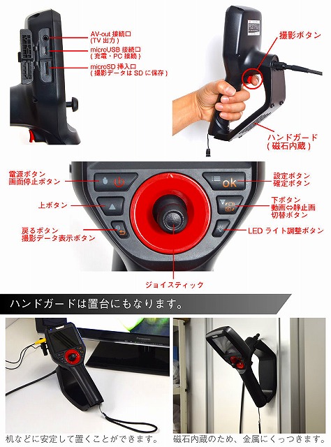 ![]() ●見たいところを思いのままに操作可能。 ![]() ●サイズ詳細 ![]() ●各ボタン・その他の機能紹介 操作に使用するボタンはわかりやすく、どなたでも簡単にご使用いただけます。 撮影ボタンは持ち手の裏側にあるトリガーボタンとなっておりますので、撮影もスムーズに行えます。 本体左側面にはAV出力時に使用するAV-out接続口や充電やパソコンとの接続のためのmicroUSB接続口、撮影したデータを記録するためのmicroSDを入れる挿入口があります。 またハンドガードは置く際に置台のかわりとなり、安定して机などに置くことが可能です。 磁石を内蔵しているので、金属にピタリとくっつき固定することができます。 ![]() ■仕様