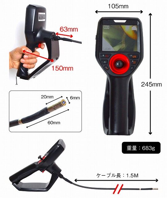 | ■特長 ●スティック操作で思いのまま、先端カメラ径6mm・360度可動式工業内視鏡です。 ●先端カメラはスティック操作スムースに動き、思いのままに確認したい場所にカメラを合わせることが可能です。 ●ケーブル長1.5MのフレキシブルケーブルはIP67防水機能搭載。 ●6段階の明るさ調整が可能なLEDライトでお好みの明るさで観覧・撮影が可能です。 ●付属のAVケーブルで大画面のテレビなどに出力しながら操作をしたり、撮影した動画・静止画を確認することも可能です。