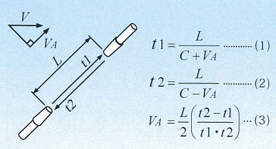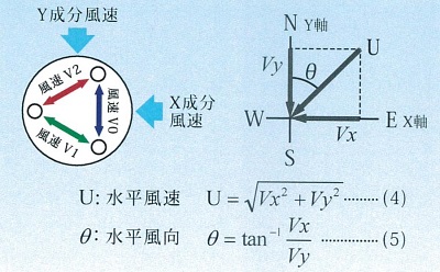 ■特長 ●90m/sの風速レンジを持つ超音波式風向風速計です。(M1145S-21S/21HS) ●ヒーター内蔵型も選択可能で降雪地域にも最適です。(M1145S-21HS) ●微風から強風域までハイレスポンスでリニアリティの高い測定が可能です。 ●可動部が無く強風時においても破損の恐れが少なく耐候性に優れています。 ■観測目的 ●大気拡散観測に、風況観測に ●環境防災分野の自動気象観測に ●低層気象及び局地気象観測に ●交通機関の安全管理用 ■測定原理 ●成分風速演算 超音波の送受波器(ヘッド)を図のように距離Lをおいて対向させ、互いに逆さ向きに超音波パルスを伝播させた場合、風速Vの超音波伝播方向成分VAと同一方向の伝播時間t1と逆方向の伝播時間t2との関係は(1)、(2)式となります。 この2つの式よりVaを求めると(3)式となり、音速Cの影響(Cは温度、湿度により変化する)を受けずにVAを測定することができます。 ![]() ●風速測定原理 本器は図のように3箇所にヘッドを配置し、V0、V1、V2、の3軸の風速を測定します。 その3軸より最適な2軸を選びX(東西)、Y(南北)成分風速を演算しています。 風速U、風向θは、X,Y成分風速をベクトル合成演算することで求めることができます。[(4)、(5)式] ![]() ■外形図 ![]() ■仕様