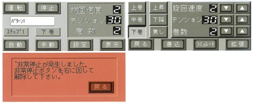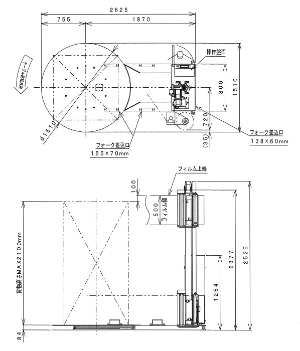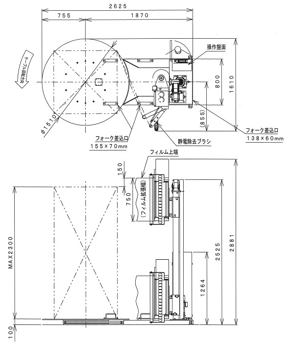 ■特長 ●フィルム消費量の削減 ワイドパワーストレッチ方式によりフィルムを縦・横3倍に延伸してフィルムの消費量を大幅に削減し、省資源に貢献します。 ●荷崩れ、荷ズレの防止 パレットと荷物を一体結束し、良好かつ適度な締め付けにより荷物の崩れ・かたよりを防止します。 ワイドパワーストレッチ方式により横方向だけの結束以外に縦方向にも結束し、荷崩れ等を大幅に防止します。 ●荷物の保護 ストレッチフィルムで荷物を覆う事により防塵、防滴効果があり、包装自体の美観を損ないません。 ●その他 フォークリフトでの移動が容易にできます。 荷物の高さはセンサーにて自動検出します。 タ-ンテーブルには堅牢な旋回ベアリングを搭載。 テーブル回転はスロース夕ート・スローストップ機能付。 ●オプション スタビライザー(不安定な荷物、軽量な荷物押さえ) テーブル変更(角テーブル、荷物特大用、その他) 別置き操作ス夕ンド(ス夕ート・非常停止) パトライト、安全柵等の安全装置 ※その他ご要望等ありましたらメールかFAXにてお問合せ下さい。 ■様々な包装パターンが可能に ●包装パターンのメモリー機能は8パターンあります。各パターンの設定変更により様々な包装も可能です。 ●各パターン毎に12ステップまで動作設定が可能になり最適な包装と、より省資源の実現が可能となりました。 ●ティーチング機能によりフィルム供給機の上昇・下降・上面被さりの停止位置を記憶させる事が出来ます。 ■タッチパネルを搭載 ●操作盤には夕ッチパネルを搭載し画面は、見やすく、操作が簡単に出来ます。 ●包装回数、テーブル回転スピード、フィルム被さり、フィルム張力等の各部設定は全てパネル上で行えます。 ●運転中の動作状況、包装総巻数、梱包総数、異常内容、異常時の復旧操作方法等をパネル上に表示します。 ●パ夕ーン名の登録・表示/日本語と英語の切替表示 ![]() ■独自の2方向フィルム延伸システム搭載 交差しあった2本のローラー(くし歯状)間にフィルムを通します。 ローラーそれぞれが固有の回転速度をもっており、フィルムはこの間で幅方向と長さ方向の2方向に引き伸ばされながら通過します。(図1) その後バナナローラーを通る際に、幅万向に広がって張りを与えられます。(図2) こうして延伸されたフィルムが荷物を包んでいきます。 ![]() ■寸法図 ▼M1297A111-W8Y ![]() ![]() ▼M1297A111-E5Y ![]() ![]() ■仕様