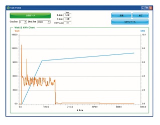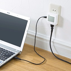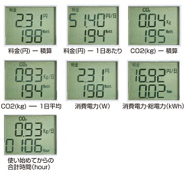 ■特長 ●コンセントに差し込んで簡単&便利にボタン1つですぐ計測できます。 ![]() ●USB接続でパソコンでも測定データ(消費電力、電力量、時間)を確認でき、データの保存が可能です。 ※計測データ(CSVファイル形式)は10分間隔で約1ヶ月分の計測、保存ができます。 ※データは定期的に保存してください。約1ヶ月を過ぎますと古いデータは新しいデータに上書きされ消えます。 ![]() ![]() ![]() ●消費電力(W)、積算電力量(kWh)、積算時間(Hour)、積算電力料金(円)、CO2排出量(kg)の5種類が計測できます。 ●液晶画面に数値で表示されるので、一目で計測できます。 ![]() ■使用方法 消費電力モニターの下面差込口に計測する機器の電源プラグをしっかり差し込んで、壁のコンセントなどに差し込みます。計測したいボタンを押して数値を読み取ります。 パソコンとの接続は付属のUSBケーブルを使います。専用ソフトをインストールし、計測値がパソコンで確認できます。 ※熱器具・調理器具・エアコン・冷蔵庫・洗濯機・乾燥機など、壁のコンセントへ直接接続することが決められている機器には使用しないでください。上記の製品を本製品に接続した場合、接続不良などの要因により、本体が熱くなったり、電源が切れたりする場合があります。 ■仕様
