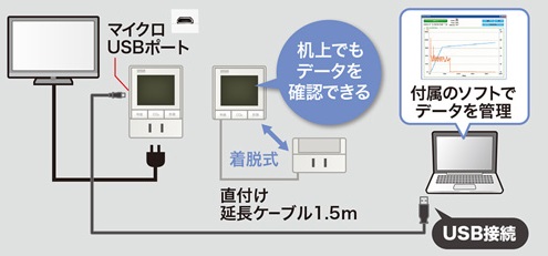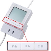 ■特長 ●コンセントに差し込んで簡単&便利にボタン1つで測定できます。 ![]() ![]() ●消費電力(W)、積算電力量(kWh)、積算時間(H)、積算電力料金(円)、CO2排出量(kg)、温度、湿度の7種類が測定できます。 測定確認していない場合は時計が表示されます。 ●机上で測定データを確認できる、延長ケーブル付きです。 ![]() ![]() ●液晶画面に数値で表示され、ひとめで計測できます。 ●USB接続でパソコンでも測定データ(消費電力、電力量、時間)を確認でき、データの保存が可能です。 ※計測データ(CSVファイル形式)は10分間隔で約1ヶ月分の計測、保存ができます。 ※データは定期的に保存してください。約1ヶ月を過ぎますと古いデータは新しいデータに上書きされ消えます。 ![]() ![]() ![]() ■操作方法 電源スイッチはありません。ご家庭のコンセントに差し込むと計測を開始します。 動作中は常に計測を行っています。設定により選択される計測値がLCDパネルに表示されます。 <注意> 熱器具・調理器具・エアコン・冷蔵庫・洗濯機・乾燥機など、壁のコンセントへ直接接続することが決められている機器には使用しないでください。上記の製品を本製品に接続した場合、本体が熱くなったり、電源が切れる場合があり、接触不良を起こす可能性があります。 ■仕様