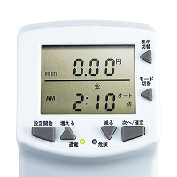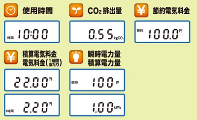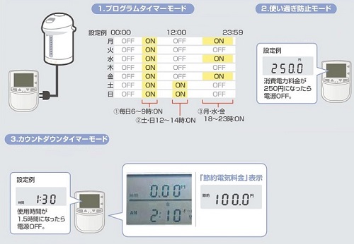 | <使用方法> ①電源プラグを差す ②3通りのモードから1つを選んで電源制御設定 ※常時電源ON・常時電源OFFも可能です。 1.プログラムタイマーモード:曜日・時間を指定して電源ON・OFF。(全20通り) 2.使い過ぎ防止モード:電気料金があらかじめ設定した金額に達した時に自動的に電源OFF。 3.カウントダウンタイマーモード:あらかじめ設定した時間になると自動的に電源OFF。 ![]() ③モニターでデータ確認 「表示切替」ボタンで、7種類の計測データ表示を切替え。 <「節約電気料金」表示>さらに、タイマー機能を使った場合に1週間で節約できる おおよその電気料金を表示可能。節約が一目でわかる! ※「プログラムタイマーモード」「使い過ぎ防止モード」、「カウントダウン タイマーモード」は、同時に設定できません。 ■各種計測項目&機能