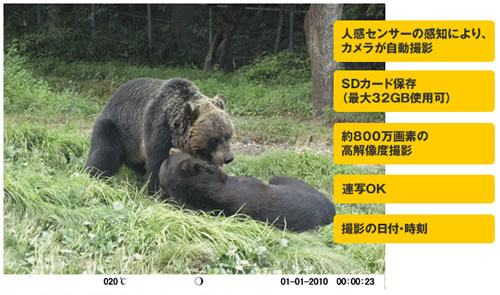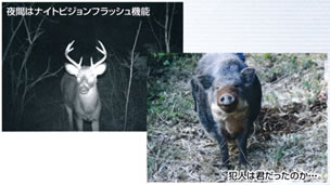 | ■概要 屋外型センサカメラユニットは人感センサーを内蔵した電池で作動する防水型監視カメラ。 センサー反応時のみ静止画または動画を自動撮影し、SDメモリーカードに保存。 画像内には日付・時刻も自動でスタンプされる。 ナイトビジョンブラックLEDフラッシュ搭載で、防犯や監視の行き届かない森林や野外施設、 動物の生態観察まで幅広く活用できる。 ・N138TRPH-CAXLTの機能画像 ![]() ![]() ※M138TRPH-CAXLT、M138TRPH-CANV(外付けモニター) ■フィールドスキャン機能 センサー反応に関係なく、設定した時間帯(2パターン設定可能)を自動的に撮影する機能。 ![]() ■屋外施設や森林の無人監視、鳥獣被害対策、気になる場所の証拠取得に。 (M138TRPH-CAXLTの説明及び画像) ●撮影写真 静止画(JPG形式)または動画(AVI形式)での自動撮影。 撮影した写真には日付・時刻などが自動スタンプされ、画像整理に役立つ。 フィールドスキャン機能:設定した時間に自動撮影。 音声記録:動画撮影時のみ音声記録設定可能。 ![]() ●用途 人の目の行き届きにくい場所の監視・防犯、鳥獣被害対策、動物の生態観察、 私有地(駐車場・山林)・工場・資材置き場・広大な敷地(ゴルフ場、田畑、果樹園)などの 監視・管理・牽制効果・証拠写真の取得など。 ●注意点 他人のプライバシーを侵害する撮影および使用を禁じます。 ■タイプ