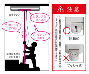 ![]() ●足場や高所作業車不要 ●約4mまでの高さにある直管蛍光灯(ソケット回転式)のランプ交換ができる ●ランプを掴んで、ポールを回すだけの簡単操作 ●ポールはアルミ製で軽く、操作も楽々 ●適合する蛍光灯:FL,FLR,FHF,T8形(管径:φ25 - 32.5mm) 18W-40Wの直管蛍光灯に適合 ■3ステップの簡単操作で直管蛍光灯を交換 ![]() ●継手を反時計方向に回すのみで強固なロックがかかり、ランプ交換時の回転力に耐えることができます。 ![]() ■仕様