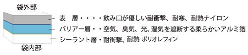 ■仕様![]() ■概要 ●光、水、空気を通さない気密性容器【レトルト飲み口付真空包装袋】は118℃〜115℃の温度で30分間、 加圧加熱殺菌、又は85℃30分間、ボイル殺菌が出来ます。 ●瞬間凍結不可、緩慢冷凍食品に使用した時は-18℃迄。 それ以下は最内装のCPPが急激にもろくなり、食品を落下させると破袋の原因になります。 又、解凍後はお早めにお飲み(食して)下さい。電子レンジはバリアー層がアルミ(AL)の為、不可です。 未開封でも冷蔵してお早めに消費してください。 ●家庭で防災水を作ろう! (作り方) やかんで水道水を10分間沸騰して塩素を飛ばして(そのまま入れると水道水の塩素の臭いがします。) やけどしないように漏斗を使い、直接入れずに100CC入る陶器に熱湯を入れて漏斗から袋に入れてください。 きれいなペットボトルの水があれば便利です。 袋を両方に広げて折り曲げると脱気しますからアイロン台の端に袋を垂らして、 家庭のアイロンを高温に設定して裏表、各10秒押し当てると密封できます。 シールがちゃんとできたかは、きれいなシール面と、60K位の体重で踏んでみると良いです。 溶着できていれば、破袋しません。 水なしで練習してから、アイロンの火傷に注意してから実行されるとうまくいきます。 その後、鍋のふたをしないで熱湯の入った鍋に水(湯)が入った袋を入れて中火で、30分間加熱すると防災水ができます。 ●食品工場と違い、家庭は製造の環境や、衛生技術管理者がいない為、煮沸殺菌した防災水を販売できません。 ●本品の使用は、防災水を作って長期保存するのではなく、 災害時での緊急分配水が必要な災害現場や医療用、訓練、家庭の冷蔵短期飲料水、緊急の炊き出しや、 ラップの代わり等にご利用してください。 ●携帯保温剤(カイロ)の代用になります。火傷に注意してください。 ●緩慢冷凍(-18℃〜-0℃の家庭冷凍庫)した氷水は、簡易冷却材にも併用できます。 ●ジュースなどを入れる時は、充填密封後85℃30分間、ボイル殺菌をして(鍋のふたをすると袋が膨れるのでふたをしない) 冷却して冷凍してシャーベット等を作るのに解凍したらお早めにお召し上がり下さいませ。 ラップ、ホイル、タッパー等と同様の調理器具として、自己責任の中でご利用してください。 ご家庭で、未発泡飲料、プリンやスムージー、ワインや水割り、リゾット、ジャム、ソース、色々お試しくださいませ。 ●18g無洗米を入れ85CC熱湯を入れて密封して85℃で30〜40分間炊いて15分間蒸らすと柔かいご飯100gができます。 温かいうちに必ず早めにお召し上がりください。塩を入れると塩ご飯になります。 大量に作る際は、冷水等で2℃位に急速に冷却して、冷蔵商品と同じように保存してお早めにお召し上がりください。 レトルト製品とは違います。ラップで包んだおにぎりの感覚です。 ●アイデア次第で、水分量を替えて中身に具材、調味料を入れるといろいろなご飯が出来ますが、 あくまでも家庭用として自己責任で、冷凍しても解凍後はお早めにお召し上がり下さいませ。 ●氷温近くに冷却されたご飯はベーター化して硬くなります。 その場合は、広く袋を開口して少量の湯を入れたり、未開封のまま熱湯で少し温めると温かく美味しく召し上がれます。 ●業務用(販売用)で使用される場合は、袋をご利用する上で、内容物、殺菌方法、保存方法、賞味期限設定等、 本袋でご確認、実験、検査の上、ご了承の上でご利用くださいませ。 ●家庭のシャンプー、台所洗剤等の詰め替え等にもご利用できます。 ●キャップ無しですが、注ぎ口を折り曲げるとこぼれにくくなります。 ●押して絞りだす逆流しない射出する構造の袋です。 ●キャップは手で回し開栓するのに力が必要ですが、袋ですから開封しやすく、又、安全な丸い切り口にしています。 ●最外層を厚い耐熱ナイロンにしている為、耐衝撃、耐寒(緩慢冷凍-18℃迄)性があり、 安全な優しい飲み口の設計になっています。 ●狭い押し出す飲み口、中くらい、広い開口部が出来る3か所に開口部が出来る工夫をしています。 ●ペットボトルやキャップ付きパウチと比較して、クルクル丸められる、ゴミ削減、省資源容器です。 ●バリアー性を高める為に、スタンドパウチでない平袋を採用しています。 ●本品は食品衛生法に基づいて定められた「食品、添加物等の規格基準」に適合しています。 |