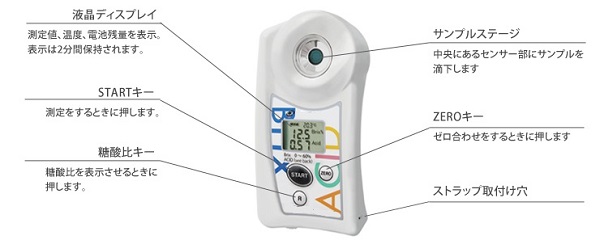 ●酢・ビネガー用の糖度と酸度を測定できます。 ●丸ごと水洗いできる防水仕様(IP65) ●糖酸比も素早く表示 |