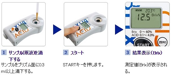 ■特長 ●フルーツの出来等において大切な糖(Brix)と酸を、この1台でどちらも測定できます。 ボタンを押すだけの簡単操作で、果物や野菜には欠かせない糖酸比も素早く表示。 測定に便利な付属品が全て入ったマスターキットをご用意しました。 ![]() ●キットには、以下が標準付属になります。 天秤、ポリビーカー2個、 アタッチメント、スポイト5本、電池2本 *試薬が一切不要になりました。酸度はサンプルを精製水(蒸留水)で希釈して測定します。(50倍希釈) ![]() ■測定方法・目盛切替方法 ●Brixの測定 ![]() ●Acidの測定準備 サンプルを1.00g測り、所定[*1]の重さになるまで精製水を足し希釈します。[*2]よくかき混ぜてください。 *1 目盛により、希釈する倍率が異なります (日本酒につきましては、製造段階と最終製品で希釈倍率が異なりますのでご注意ください。) *2 最後の微調整には付属のスポイトをお使いください。 ![]() ●Acidの測定 ![]() ●糖酸比の表示 測定値(BrixおよびAcid)の表示中にRキーを押すと糖酸比が表示されます。 ![]() ●補足説明(図式)