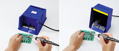 | 縦置き・横置きが可能な卓上吸煙器 オプションのアームスタンドを使えば3通りのスタイルが可能 ![]() ■特長 ●縦置きの場合・・・広範囲の煙を吸引可能 ●横置きの場合・・・流速が早くなり、手元の煙を強力に吸引可能 ![]() ■仕様