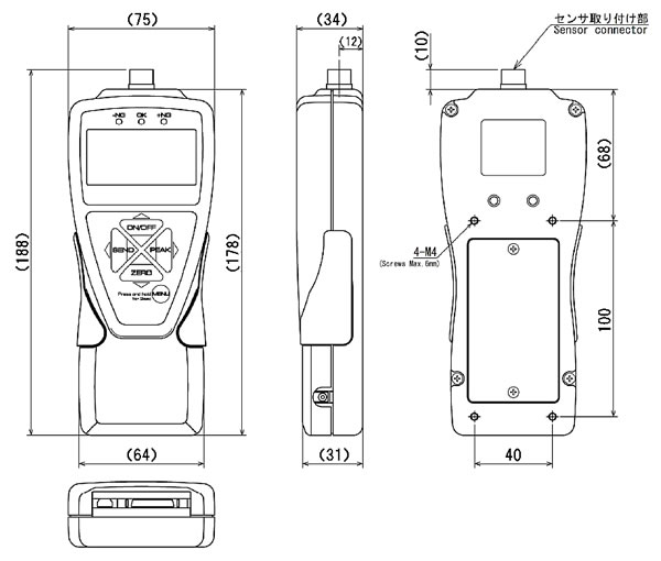 [フォースゲージの応用] たとえばこんなことが可能です。 1.荷重値に合わせて外部機器を制御したい。(指定したチカラで機械を止める、動作を変えるなど) 2.指定の荷重値を負荷したい。(一定のチカラで物体を押さえつけるなど) 3.作業工程に連動した検査装置を作りたい。(検査工程の効率化など) 4.合否判定機能を利用して、不良品の早期発見につなげたい。(品質管理の徹底など) ■外観図 ![]() ■仕様