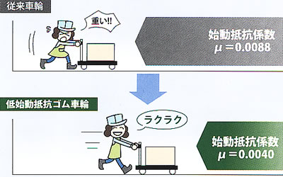 | ■特長 キャスターのタイヤ部分に低始動抵抗性ゴムを使用。 台車の始動抵抗を抑え、楽な動き出しと台車の操作性を向上。 作業環境の改善、および作業者の身体的負担を軽減することができ、耐久性・耐摩耗性にも優れています。 ■始動にかかる力を1/2以下に。 ![]() ![]() ■タイプ