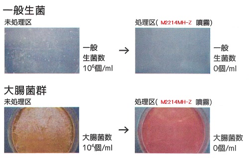 ■特長 ●規定量を水に溶かすだけ ●ランニングコストの削減 ●水で洗えるので手荒れなどの心配がなく、ベタベタしません。 ●スプレーを数回噴射して油を乳化、汚れを浮かせて洗い流します。 ■衛生面を考えた場所での利用がおすすめ ●飲食店などの厨房・床・テーブル・カウンターなどの清掃⇒食品に害がありません! ●飲食店のグラス・ジョッキ等の洗浄⇒洗剤・石鹸カスが残りません! ●食品を取扱う工場内の清掃 ⇒環境に優しく排水できます。 ●お客様の出入りの多い接客業で、お客様が店内で触れる場所の清掃 ⇒人に害がありません! ■試験報告書 本剤溶液(500:5)の噴霧後の殺菌能力についての試験 方法: 初発菌数が一般生菌数106個/ml、大腸菌群数104個/mlとなるようにガラスプレートを作成し、それに本剤溶液(500:5)を噴霧したものを処理区とし、噴霧しないものを未処理区とした。 それぞれふき取りキットにて拭き取ったあと、寒天培養し、一般生菌・大腸菌群について試験を行った。 結果: 一般生菌、大腸菌群ともに、未処理区では菌の増殖が確認されたが、処理区では菌の増殖はみられなかった。 一般生菌:標準寒天培地にて35℃、48時間培養 大腸菌群:デスオキシコレート寒天培地にて、35℃、24時間培養 ![]() ■仕様