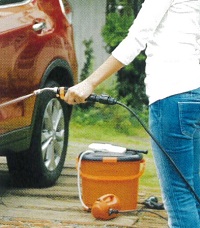 車の「シガーソケット」が電源に、コンセントにも水道蛇口にも接続不要な携帯タンク付洗浄機です | 携帯タンク付洗浄機 品番 M2214PE-3125H |