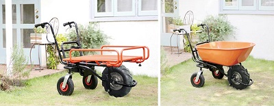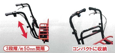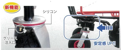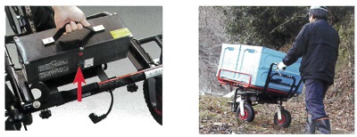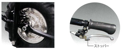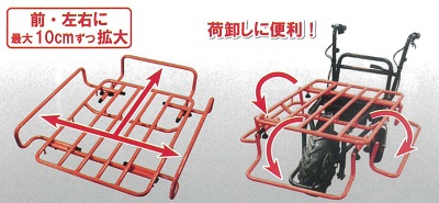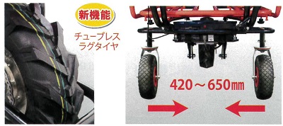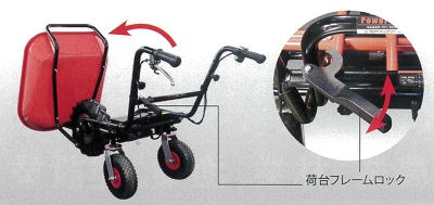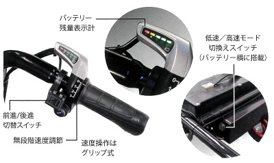 ■特長![]() ●前も後ろも、スイッチひとつで切り替え ●バイク感覚でだれでも簡単、速度操作はグリップ式を採用 ●高速・低速モード選択機能/スピード無段階切換え。スイッチ1つで低速・高速モードが選べ、グリップ操作で簡単に無段階でのスピード調整が可能 ●バッテリー残表示 バッテリー残量を手元に表示。使用しながら確認ができる。 ![]() ●ディスクブレーキ、ストッパー付ブレーキロック搭載 ![]() ●前輪がラグタイヤになり、泥土の悪路も安定走行。後輪の幅は道幅に合わせて約42cm~65cmに調整可能。 ![]() ●荷台パイプ枠を下に折り曲げれば、荷卸しが楽ちんスムーズ。パイプ枠は前・左右に10cmずつ伸び、大きな荷物にも対応。 ![]() ●ハンドルの高さは3段階(約50mm間隔)で調節可能。 ●ハンドルを内側に折り曲げ可能 ハンドル部分を内側に折り曲げることで、よりコンパクトなスペースに保管・移動ができる。 ![]() ●安定感アップ 従来品よりも重心をハンドル寄りに移動し、さらに安定性がアップ。 ![]() ●ガソリン不要。電気のみで約3時間連続走行 フル充電(8時間)で3時間の走行が可能。夜間に充電しておけば、翌日すぐに稼働できる。 ※使用環境、使用方法により時間は異なります ●バッテリーは簡単に外せ、家庭用コンセントで充電OK。 ![]() ●ワンタッチで荷台がダンプカーのように反り返るので便利。(ダンプ機能) ![]() ■仕様 ![]()