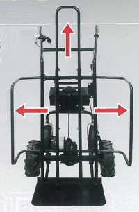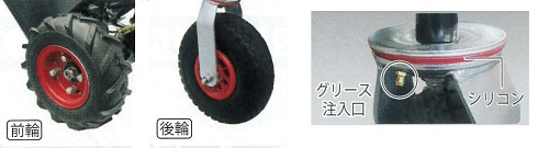 ■特長 ●パワフル&安定運搬 最大積載量250kg ●縦置き可能。重い荷物も楽に乗せられ、収納場所をとらない ●悪路に強いチューブレスラグタイヤ ●登坂能力12度(250kg積載時) ●フル充電連続走行 約2.5時間 ●バック走行 ●家庭用コンセント充電 ●前進、後進、スピード調節も簡単操作で思いのまま ・電池残量表示計:操作中も充電残量を一目で確認できる ・前進/後進切替スイッチ ・グリップ式速度調節:スピードは無段階で調節可能 ・低速/高速モード:切替スイッチ(バッテリー下に搭載) ●フットペダルを踏むだけで簡単に「縦置き」が可能 重い荷物でも積み下ろしが楽に。収納時にスペースを取りません。 ![]() ●安心機能を搭載 ディスクブレーキ/ストッパー付ブレーキロック ![]() ●パイプ枠は、荷物のサイズに合わせて「拡張」「取り外し」が可能。大きい・長い荷物にも対応。 【拡張前の内寸】(約)幅50×高さ102㎝ 【上方向拡張】約40㎝、取り外しも可能 【左右拡張】約15㎝ずつ拡張、取り外し可能 ![]() ●電動/手動モードはレバーで簡単切替 ![]() ●デファレンシャルギアでスムーズなハンドリング ![]() ●バッテリーは取り外しが簡単、家庭用コンセントで充電。バッテリーを本体に載せたまま直接充電も可能です ![]() ●前輪「チューブレスラグタイヤ」、後輪「ノーパンクタイヤ」 グリース注入口付き、スムーズに動かせる後輪 使用中に草などが挟まらないよう、シリコンで連結部の隙間を無くし、さらにグリース注入口も搭載。 ![]() ■仕様
