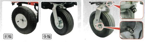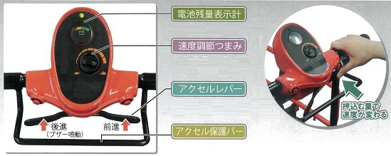 ■特長 ●機械が苦手な方にも分かりやすい、シンプルな操作パネル 【電池残量表示計】運転中も充電残量がひと目で分かります。 【速度調節つまみ】無段階のスピード調節ができ、低速から始められるので安心。 【アクセルレバー/前進・後進切り替え】 右のレバーを押せば前進、左のレバーを押せば後進、レバーを離せば停止、これ以上なく簡単です。 【アクセル保護バー】 アクセルレバーを囲うバーは、ふいに寄掛かかってレバーを押してしまったりしないための配慮です。 ![]() ●パイプ荷台の拡張機能で大きな積載物にも対応 荷台のスペースは、約110×70cm。 52.5×36.5cm サイズのコンテナボックス4 個を平積みできる広さです。 さらに、前枠は取外すことができ、横枠も左右に各10 ㎝の拡張、または取外しもできるので、長さのある積載物や、大きめのボックスにも対応できます。 ![]() ●前輪は「チューブレスタイヤ」後輪は「ノーパンクタイヤ」 ●グリース注入口付き、スムーズに動かせる後輪 ![]() ●充電は、家庭用コンセントでOK 付属の充電アダプターを本体横の充電口に差し込み、家庭用コンセントにつなぐだけ。バッテリーを載せたままで充電ができます。 コンセントが遠い場合は、荷台中央の扉を開けて、バッテリーを取出しての充電も可能。最長充電時間は約12 時間、フル充電で連続約1.5 時間の走行が可能。ガソリンを使わないので扱いやすいという点も、電動タイプの魅力です。 バッテリーボックスには、小物や予備のバッテリー(別売)も収納できます。 ![]() ●安全機能を搭載 【モーターブレーキ】モーターに過負荷が掛かると、安全装置が作動し電流を遮断、停止します。 【後輪ストッパー】左後輪にはストッパーがあり、車輪を固定できます。 ![]() ●電動/手動モードの切り替えも 荷台下のクラッチレバーを引き、「モーターブレーキスイッチ」をOFF にすると、 手動の運搬車として使用可能。用途や場所に応じて切り替えたり、万が一使用中に充電が無くなっても、立ち往生せず移動を続けることができます。 ![]() ■仕様