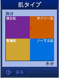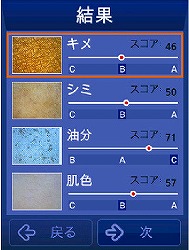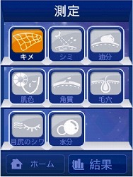 ■特長![]() ●ハンディタイプのカウンセリングツール ●お客様のお肌の分析結果を、それぞれの年代の平均的な値と比較し、 評価をA・B・Cで表示します。 ●お肌のキメ、シミ、油分、肌色、角質、毛穴、目尻のシワ、水分の8項目測定 ●年代選択 お客様の年齢に合わせ年代を選択できます。 ![]() ●測定メニュー 8個の項目からお好きな測定項目を任意に選択できます。もちろん、全項目の測定も可能です。 ![]() ●撮影画面 手元の画面に鮮明な画像を映し出します。 ![]() ●画像処理画面 撮影した画像に画像処理を施します。 ![]() ●結果 測定結果は測定値を0~99、評価をA・B・Cで表示します。 測定結果は、本体内に最大100件保存できます。USBケーブル (別売り)を介して、データをPCに移動可能です。 ![]() ●センサー詳細 結果画面で水分を選択すると、「肌タイプ」が表示されます。「肌タイプ」は水分と油分のバランスです。 ■仕様