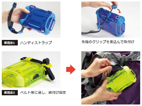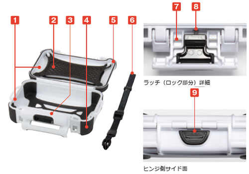 気圧の変化によりケースが開かなくなる現象や、温度の寒暖差による水分の引込現象を防ぎます。 ■ストラップの取付け・使用方法 ![]() ■タイプ・寸法図
