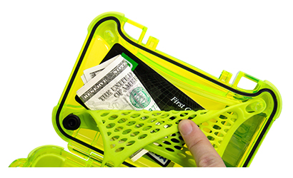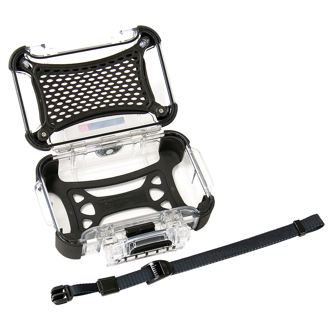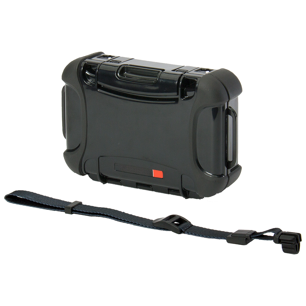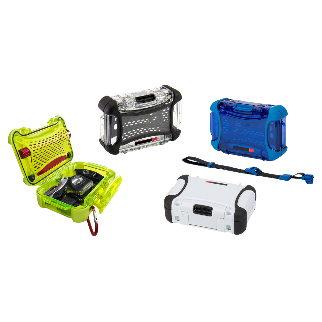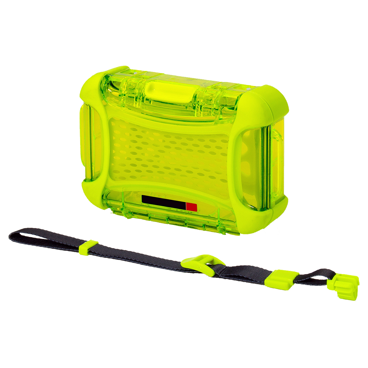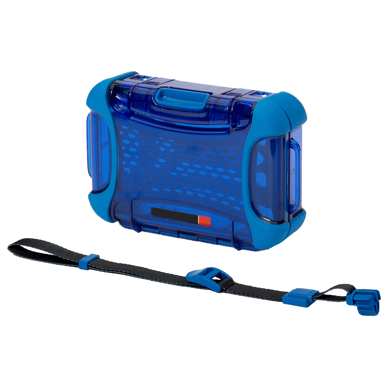 | スタイリッシュなコンパクトサイズで持ち運びがしやすい防水ポータブルケースです。 サイドにスリット穴が付いており、ストラップやベルトを通す事が可能です。 携帯電話・無線機器・ポータブルオーディオなどの小型電子機器の収納に適しています。 ![]() ■特長 ●保護等級IP65の優れた防水性 内部に粉塵が浸入せず、12.5L/分であらゆる方向からの3分以上の散水に耐える防水・防塵性 ![]() ●内圧調整バルブが付属 内圧調整バルブ内は空気を通し水を通さないゴアテックス系のフィルターが内蔵されております。 航空機での輸送や登山の際に気圧が変化し、ケースが開かない現象や、温度の寒暖差による内部空気の収縮で、水分を引込む現象を防ぎます。 ●耐衝撃性の高いポリカーボネート樹脂 耐衝撃性の高いポリカーボネート樹脂を使用し、コーナー部は弾力性のあるエラストマゴム製のガードが付いていますので、落下等の衝撃で容易に割れません。 ●ロック機構付き開閉ラッチ 開閉ラッチはロックレバー付きです。ロックレバーを押さない限り外部からの衝撃でカバーが開くことはありません。 ●付属ストラップをベルトに通し、締付固定可能 付属ストラップは手に通すのみでなく、サイドのスリット穴に通して締付固定する事も可能です。 また、サイドのスリット穴に市販の固定バンドを通し、電柱・ポール等に取付る通信機器等にもご利用頂けます。 ![]() ●シリコンゴム製ネットで、スマートフォン・小物・カード類の収納も可能 ![]() ■構成内容 ![]()