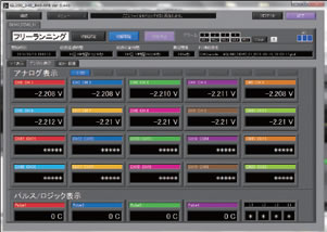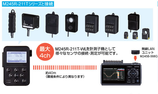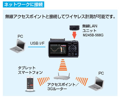 ※3:サンプリング速度によっては、ch数に制限があります。 10ms:1ch、50ms:5ch、100ms:10ch M245R-211T接続時の収録時間については、メーカーホームページを参照下さい。 ●リング収録機能 設定した収録点数以上になると、古いデータを削除しながら最新のデータのみを残します。 (設定した収録点数)設定可能点数:1000点~2,000,000点 ●リレー収録機能 M245L-240Gの1回のデータ収録容量は2GBとなります。 本機能を使用する事により、データを取りこぼし無く2GB単位でファイルを区切って連続収録できます。 ●収録中のSDカード交換機能 データ収録中にSDカードの入れ替えが可能な機能です。 ■その他の主な機能 ●アラーム出力機能 異常信号発生時に、アラーム信号を出力することが可能です。 各チャネルで条件設定が可能です。出力は4出力を装備しています。 ●3WAY電源に対応M245L-240Gの駆動電源には、AC電源、DC駆動※4、バッテリ駆動※5を用意しています。 ※4:DC駆動ケーブル(M245-514G)が必要 ※5:バッテリパック(M245B-569G)が必要 ■無線LANユニットでワイヤレス計測 無線LANユニットを装着することで、「M245R-211Tシリーズと接続」するか、「ネットワークに接続」する事が可能です。 ![]() ![]() ■簡単操作を実現した標準付属PCソフトウェア/スマートデバイスアプリ ○PC ●最大1000chまで対応 本ソフトウェアは、最大1000chまたは、最大10台まで接続が可能です。 ●多彩な測定画面 Y-T表示、デジタル表示、統計/履歴の3つの計測画面を装備。 また、ダイレクトエクセル機能も搭載されているので、測定開始とともにエクセルへダイレクトデータ転送が可能です。