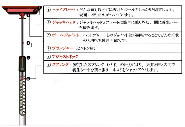 | ■特長 ●コンパクトで軽量なポールは一人でも簡単に養生ができます!! ●養生テープも脚立も不要 ●ゴミ・ホコリをシャットアウト ●天井の塗装やクロスも傷つけない ●何度でも使用可能 ■各部名称 ![]() (!) 養生シートは同梱されていません。 養生シートは、お客様の用途により、ご自身でサイズや厚さを選んで頂きます。 お近くの建材・金物店、ホームセンターなどで御求めください。 養生シートは0.2mmまでの厚さで対応できます。 ※0.02mm以下の薄い養生シートは、静電気の影響を受けやすいため、扱いが難しいときもあります。 ■使用方法