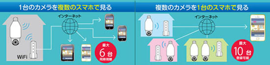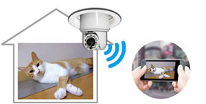![]() ■旅行中のペットの様子をいつでも見守れます ![]() ■ 最大10台のカメラを1台のスマホで管理 1台のカメラに最大6台のスマホで同時視聴可能 ![]() ■ 赤外線ライト搭載で 暗い場所や夜間でも映像を確認 ![]() ■設置例 ![]() ■仕様